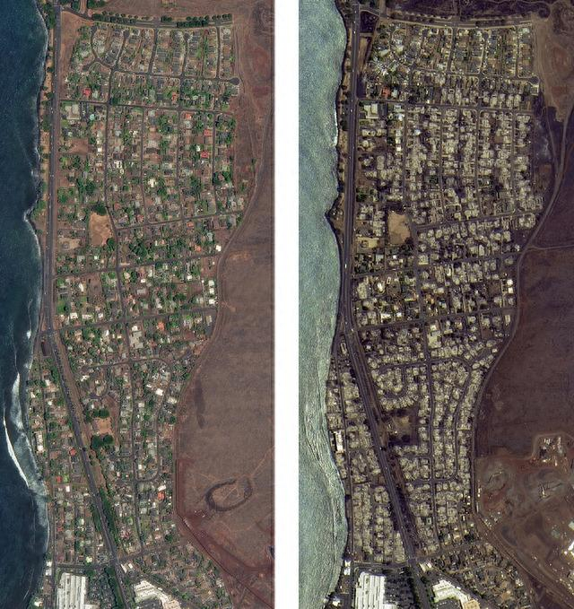 美国夏威夷州毛伊岛拉海纳小镇火灾前后的卫星影像对比。左:当地时间2022年8月22日;右:当地时间2023年8月13日。