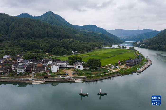 8月30日拍摄的紧邻瓯江的紧水滩镇石浦村,这也是当地“十里云河”乡村旅游的特色景观村落(无人机照片)。石浦村位于云和县县城北部,该村地理位置优越,自然风光秀丽,是省级重点历史文化古村落保护村。近年来,浙江省丽水市云和县积极贯彻“绿水青山就是金山银山”理念,持续推进美丽乡村建设工作,发展“最美梯田”、“十里云河”、“梨花乡里”等美丽乡村风景线,将地域特色与文化底蕴、农业资源与旅游要素相结合,大力发展乡村旅游产业。今年上半年,云和县全县农家乐休闲旅游接待游客48.6万人次,同比增长51.88%,营业总收入3216.8万元,同比增长51.38%。新华社记者 徐昱 摄