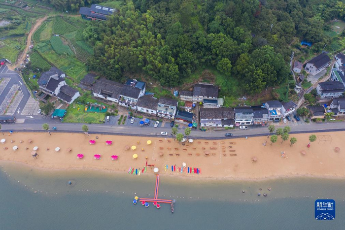 8月30日拍摄的长汀村的长汀沙滩景区(无人机照片)。云和县石塘镇长汀村位于浙江省第三大人工湖——云和湖畔、“十里云河”美丽乡村风景线的中心路段。近年来,浙江省丽水市云和县积极贯彻“绿水青山就是金山银山”理念,持续推进美丽乡村建设工作,发展“最美梯田”、“十里云河”、“梨花乡里”等美丽乡村风景线,将地域特色与文化底蕴、农业资源与旅游要素相结合,大力发展乡村旅游产业。今年上半年,云和县全县农家乐休闲旅游接待游客48.6万人次,同比增长51.88%,营业总收入3216.8万元,同比增长51.38%。新华社记者 徐昱 摄