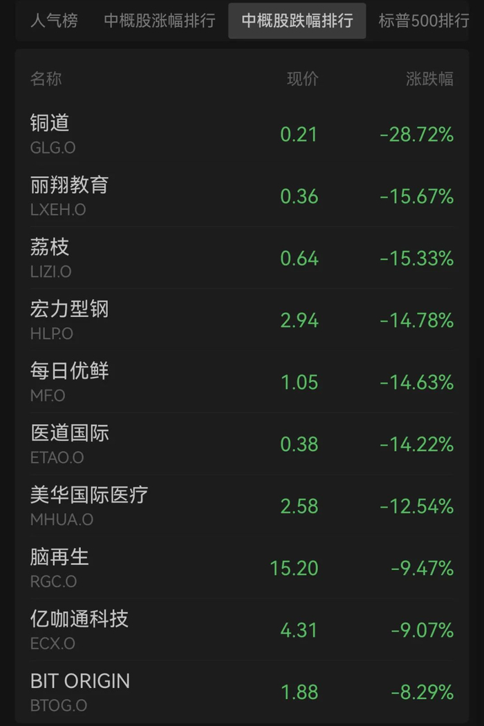 热门中概股多数下跌,铜道跌28.72%,荔枝跌15.33%,每日优鲜跌14.63%,优点互动跌7.62%,嘉楠科技跌5.63%,寺库跌5.44%,金融壹账通跌5.17%。涨幅方面,普普文化涨14.81%,再鼎医药涨11.39%,乐信涨8.04%,蘑菇街涨7.73%,拼多多涨5.28%。新能源汽车股全线走低,蔚来汽车跌2.11%,小鹏汽车跌1.36%,理想汽车跌2.19%。