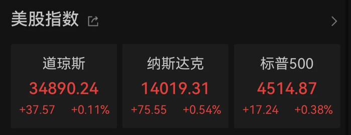 当地时间周三,美国三大股指集体收涨。截至收盘,道指涨0.11%报34890.24点,标普500指数涨0.38%报4514.87点,纳指涨0.54%报14019.31点。美股连续第四日收高。