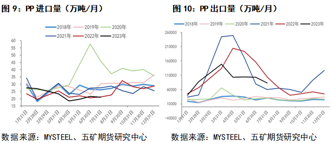 2018年9-10月进口量上升,出口量下降,进口占比较大,而目前PP进口依存度已经降至10%左右,更有利于9-10月价格启动。