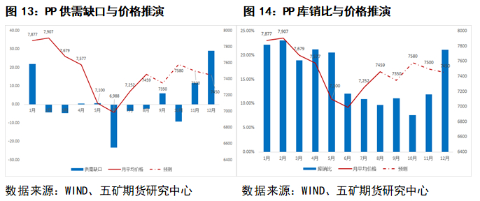 根据表5可知,9-10月供需缺口开始转好且库销比出现较大回落。图13、图14推演出PP10月价格将有小幅上涨。