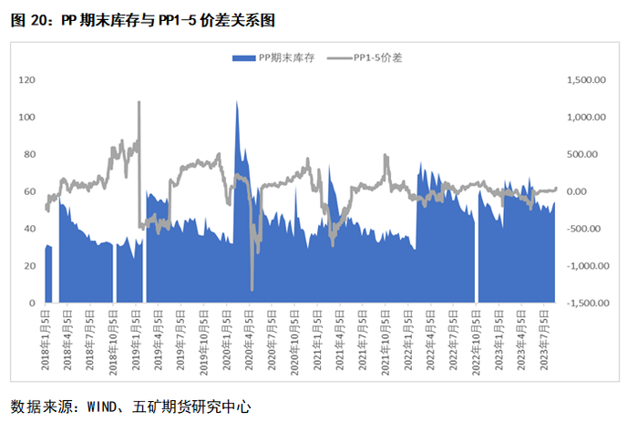 如图20所示,库存从高点边际递减时,就是PP1-5价差走阔的启动信号,目前PP库存中性偏高,待进入9月传统消费旺季后或将出现边际递减。