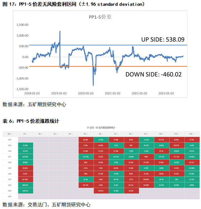 如图17所示,为提高无风险套利区间的准确性,根据2018年至今“无风险套利区间”的形式评估价差波动区间,用近6年PP1-5价差平均值作为无风险套利区间中值(39.03),置信度95%的情况下Z值为1.96,标准差为±254,所以以39.03±1.96x254作为上下限,PP1-5价差范围在[-460.02,538.09]之间。从表3走势看,PP1-5价差近三年在前一年9月均为正值,且到9月底达到最高点。