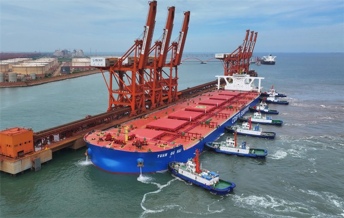 7月28日,满载约40万吨巴西铁矿石的“远谷海”轮在拖轮的协助下向河北港口集团唐山港曹妃甸港区矿石码头靠泊。新华社记者 杨世尧摄