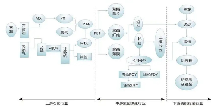 PX产业链为:原油→石脑油→混二甲苯(MX)→对二甲苯(PX)→对苯二甲酸(PTA)→聚脂→终端。