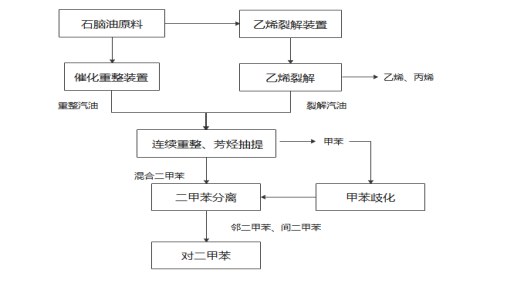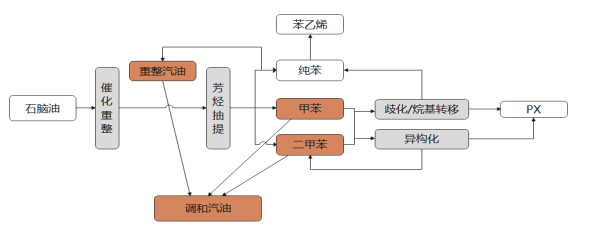 PX的生产原料是石脑油。石脑油是一种轻质油品,由原油蒸馏或石油二次加工切取相应馏分而得,按馏分又分为轻石脑油和重石脑油。由于其是由不同比例的链烷烃、环烷烃、芳烃、烯烃组成的混合物,可以用来生产烯烃和芳烃。石脑油经过催化重整或者乙烯裂解之后获得重整汽油、裂解汽油,再经过芳烃抽提工艺得到混合二甲苯(MX),然后经吸附分离制取PX。