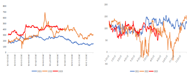 2022年,俄乌冲突影响下全球油品市场物流重构,且美国汽油库存降到了近年来低位,芳烃调油需求出现明显的增长,海外许多芳烃型炼厂切换至汽油型炼厂,导致轻质芳烃产量降低,同时随着美亚套利窗口打开,使原本出口至中国的PX量有部分转移到美国,进一步加剧了PX供需紧张的局面。可以说,芳烃调油逻辑是推动2022年PX价格走高的重要因素之一。2023年,由于美国提前准备,部分芳烃长约签订,亚洲芳烃提前流入美国。同时,今年汽油库存旺季降幅不及预期,且调油原料主要是甲苯、MX等。今年调油驱动有所减弱。
