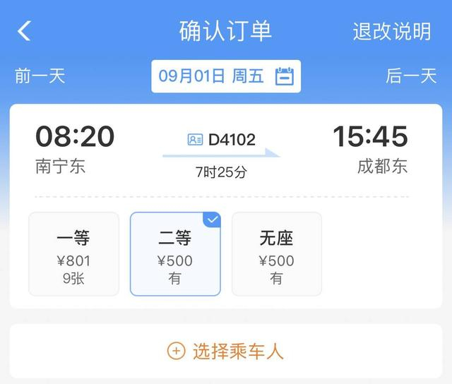 铁路12306显示,D4101次列车将于下午4点09分从成都东站发车,当晚11点抵达南宁东站,全程6小时51分,全程二等座524元,一等座840元;D4102次列车上午8点20分从南宁东站发车,于下午3点45分抵达成都东站,全程7小时25分,全程二等座500元,一等座801元。