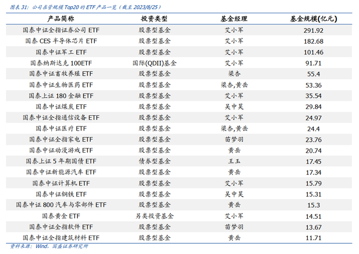 国泰基金旗下ETF产品线齐全,产品规模及流动性优势突出,为投资者提供了全方位的指数投资工具。2011年3月31日,国泰上证180金融ETF及其联接基金成立,国泰基金开始进入ETF领域。2013年是ETF开启全面创新的一年,当年,国泰基金率先发行了首只国债ETF、首批黄金基金(ETF)和首只纳指ETF,为后来者树立了行业标杆。2016年7月26日,证券ETF和军工ETF成立,填补了市场细分行业ETF领域的空白,目前证券ETF已成为行业ETF中规模最大、流动性最好的品种。2019年,布局生物医药ETF、芯片ETF、计算机ETF、通信ETF,2020年,新布局钢铁ETF、煤炭ETF、家电ETF、新能源车ETF、上证综指ETF和医疗ETF。2021年,布局软件ETF、游戏ETF、养殖ETF、环保ETF、化工龙头ETF、机械ETF、汽车ETF、建材ETF、有色60ETF、科创创业ETF、光伏50ETF、智能汽车ETF、中证500ETF、创新药沪深港ETF、影视ETF、港股通50ETF、消费电子ETF等,以及创新产品300增强ETF。2022年,新布局港股科技ETF、基建ETF、游戏沪港深ETF、标普500ETF、疫苗ETF、MSCIESGETF、工业母机ETF、矿业ETF、交运ETF、绿电ETF、1000增强ETF。2023年,新布局半导体设备ETF、港股国企ETF,进一步完善产品线。