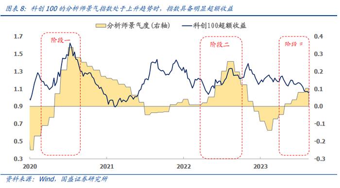 从历史超额收益(相对中证800)来看,2020年以来,科创100有三段跑出明显超额收益的行情,相对收益幅度在20%以上,这三个阶段对应的分析师景气指数有两次处于上升趋势,当前未来一段时间科创100超额收益可期。