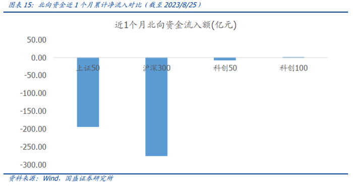 3、北向资金是市场中重要的参与者之一,从北向资金流向来看,短期科创100指数受到流出影响较小,外资较为认可科创100指数成分股的投资价值。截至2023年8月25日,从近1个月北向资金流向来看,上证50、沪深300、科创50、科创100指数的净流入分别为-193.50、-274.84、-7.05、1.58亿元,说明外资对科创100指数的成分股的投资价值较为认可。