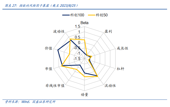从指数风格因子暴露来看,科创100指数当前的风格总体为中小市值、高流动性、高成长,相比科创50而言市值因子暴露更小。截至2023年8月25日,科创100指数当前在非线性市值、波动性、流动性、成长性等风格因子上为正向暴露,在盈利、价值、市值、杠杆、动量、Beta等因子上的为负向暴露。因此,科创100指数整体上的风格特征可总结为中小市值、高流动性、高成长。相比于科创50指数而言,科创100指数在非线性市值、价值因子上暴露更大,在市值、波动性上暴露更小,科创100的中小市值特征相比科创50而言更显著。