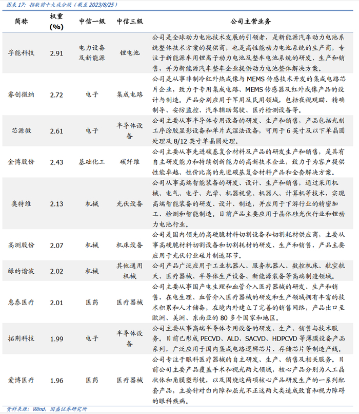 指数重仓股集中度较低,均衡布局高科创属性的公司。从指数前十大成分股来看,指数前十大权重累计占比仅为22.86%,前十大成分股集中度较低,均衡布局具备高科创属性的公司。自从2019年科创板推出以来,大量优秀的高科技企业在科创板实现上市融资,从而推动了科技创新发展,其中有许多“硬科技”企业。例如,指数前3大成分股分别为孚能科技(全球动力电池技术发展的引领者)、睿创微纳(专注于非制冷红外热成像与MEMS传感技术开发的集成电路芯片的企业)、芯源微(从事半导体专用设备的研发生产和销售的企业)。