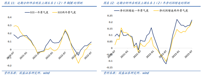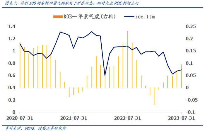 在之前发布的报告《分析师行业景气指数构建与应用》中,我们基于分析师的个股盈利预测数据,采用扩散指数的编制方法构建了分析师行业景气指数,指数在0轴以上的时候定义为扩张期,反之为收缩期。如下图所示,我们计算的科创100分析师景气指数从2023年3月底开始进入扩张区间,当前为9.4%,相对大盘ROE有望持续改善。