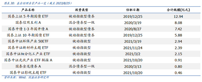 基金的基金经理为投资管理经验丰富的王玉女士。王玉女士,硕士,7年证券从业经历,4年投资管理年限。曾任职于光大银行上海分行。2016年1月加入国泰基金,历任交易员、基金经理助理。现任国泰上证5年期国债ETF、上证10年期国债ETF、国泰金龙债券、国泰信用互利债券、国泰影视ETF、新材料50ETF、光伏ETF联接基金等的基金经理。截至2023年8月25日,王玉女士在任管理基金数量为10只,在管基金总规模约44亿元,具备丰富的投资管理经验。