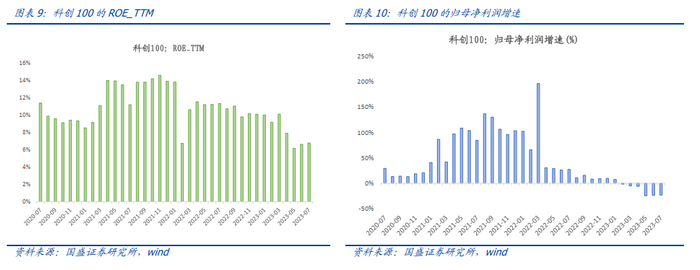 根据已披露的财务数据,我们计算了科创100最新净利润增速和ROE_TTM,发现两者均在底部企稳回升。其中ROE_TTM在最低点6%附近企稳回升,归母净利润增速在-24%附近企稳回升。