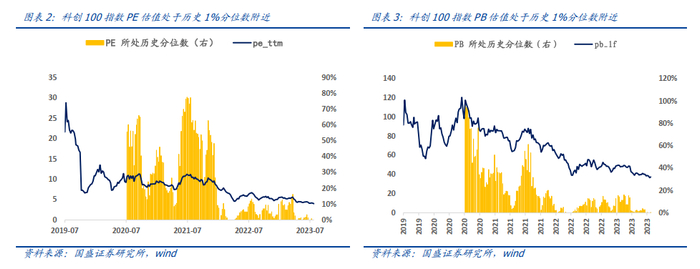 如下图所示,我们计算了科创100指数PE、PB所处估值分位数。由于科创100指数近期才发布,我们采用最早一期成分股前推的方式,以指数内PB/PE的中位数衡量估值水平。经过今年年初的短暂上涨后,二季度开始有所回调,当前位于1%分位数附近,处于历史极低水平,估值修复空间较大。