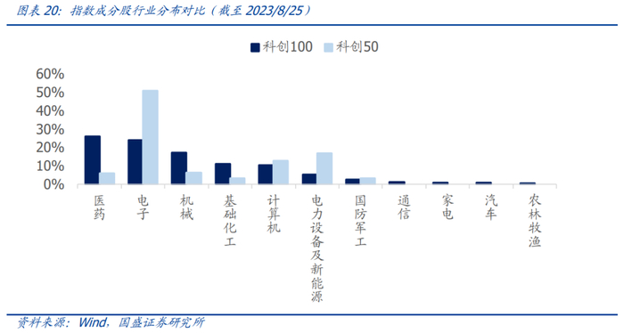 科创100的行业分布相比科创50而言科技新兴行业配置权重更大,行业覆盖广度更大。从科创100与科创50的行业分布对比情况来看,科创100覆盖的行业数量更多,涉及了11个中信一级行业,而科创50仅涉及了7个中信一级行业。科创100在医药、机械、基础化工等行业配置权重更大,且覆盖了通信、家电、汽车、农林牧渔等科创50当前没有布局的行业。