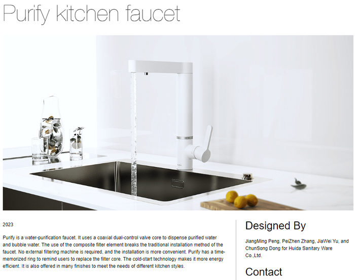近日,美国IDEA设计奖(International Design Excellence Awards)公布了2023年获奖名单,惠达卫浴Purify kitchen faucet(下称厨房净水龙头)从159件产(作)品中脱颖而出,荣获2023 年IDEA设计大奖。
