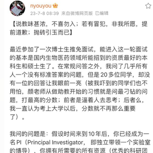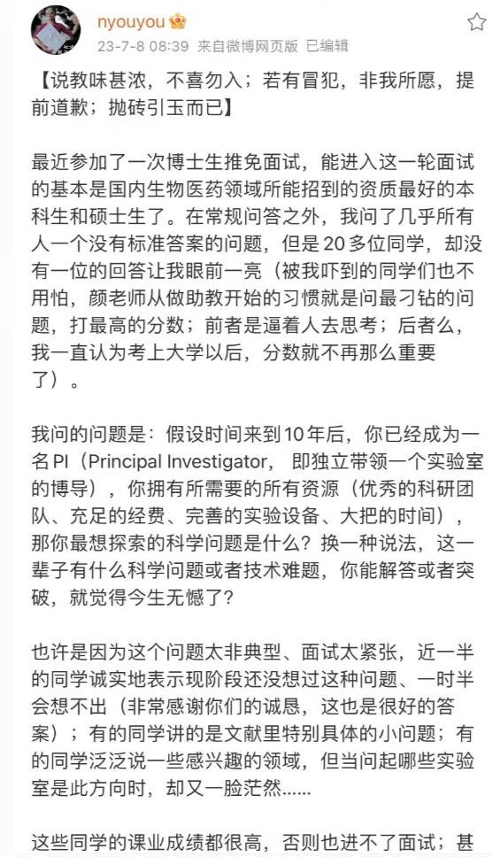 前不久在她的微博发出了“颜宁之问”。她在微博中分享,在博士生推免面试时,询问了考生们这样一道问题:“这一辈子有什么科学问题或者技术难题,你能解答或者突破,就觉得今生无憾了?”颜宁称,面对如此开放的问题,这些国内最顶尖的本科和硕士生学子们,却没有一位能给出让她眼前一亮的答案。她感慨,“人类的知识才多一点儿啊,那么多未解之谜等着我们呢;过去几年十几年的科研训练给你的是能力、是武器、是科学方法,做了PI,天高任鸟飞,第一步最重要的就是寻找值得你和团队投入大量时间和精力的问题。”