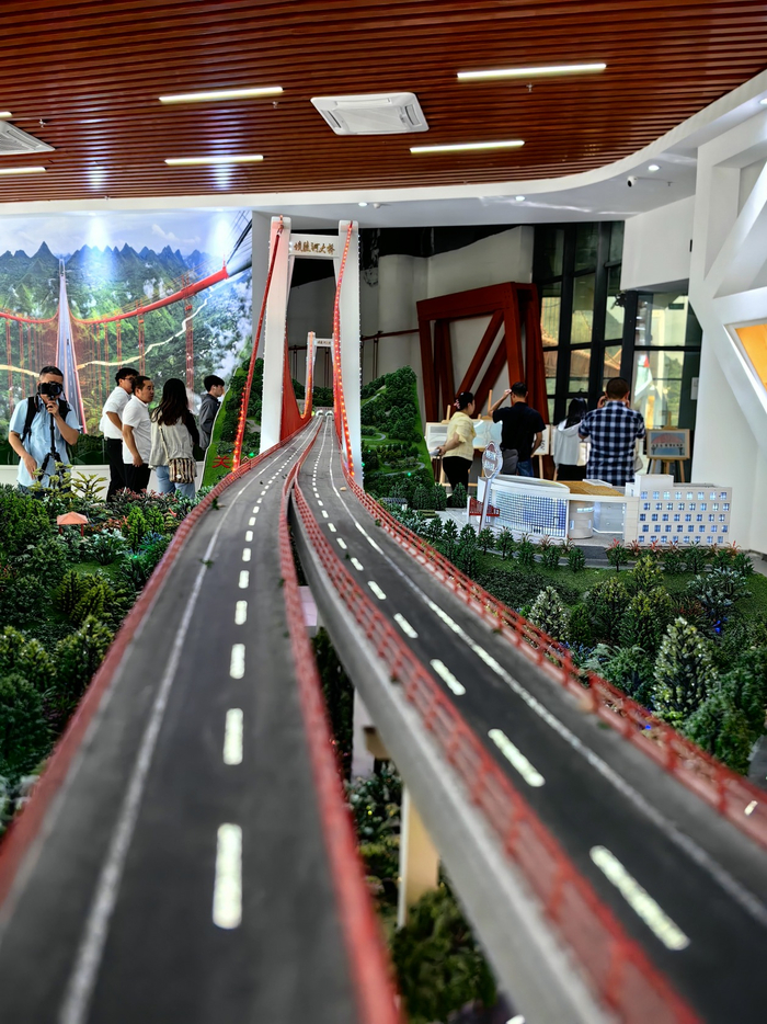 记者们行走于坝陵河大桥的步道上,头顶是疾驰而过的汽车,脚下是大地、村庄河流,步道两端则是大山巍峨,巨大的高度落差给人一阵阵的眩晕感。如此复杂的地理环境下,大桥如何建成?在大桥东岸下方的桥梁博物馆,记者有了答案。