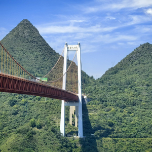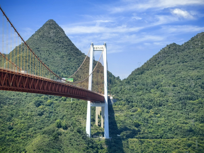 坝陵河大桥是钢桁加劲梁悬索桥,主跨径达1088米,东主塔塔高185.788米,桥面距水面370米,是国内少有的可进入大桥内部观光的超级工程大桥。