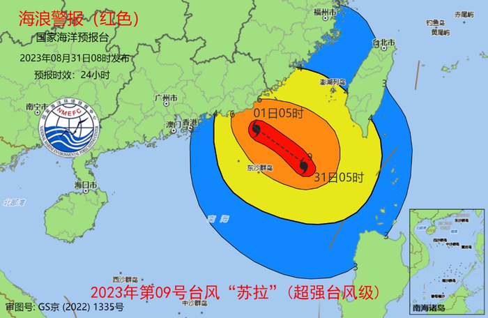 国家海洋预报台根据《海洋灾害应急预案》,发布海浪红色警报和风暴潮橙色警报。受今年第9号台风“苏拉”(超强台风级)的影响,预计:8月31日中午到9月1日中午,南海东北部、台湾海峡南部近海海域海浪预警级别为橙色;广东东部近岸海域海浪预警级别为红色,福建南部近岸海域海浪预警级别为黄色,福建北部近岸海域海浪预警级别为蓝色。预计8月31日上午至9月1日中午,福建省厦门市、漳州市、广东省潮州市和汕头市的风暴潮预警级别为橙色,福建省福州市、莆田市、泉州市、广东省揭阳市和汕尾市的风暴潮预警级别为黄色。