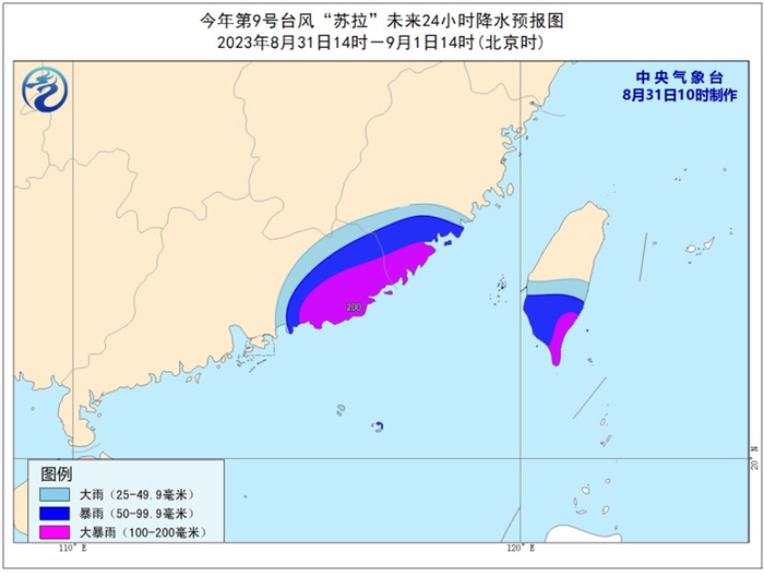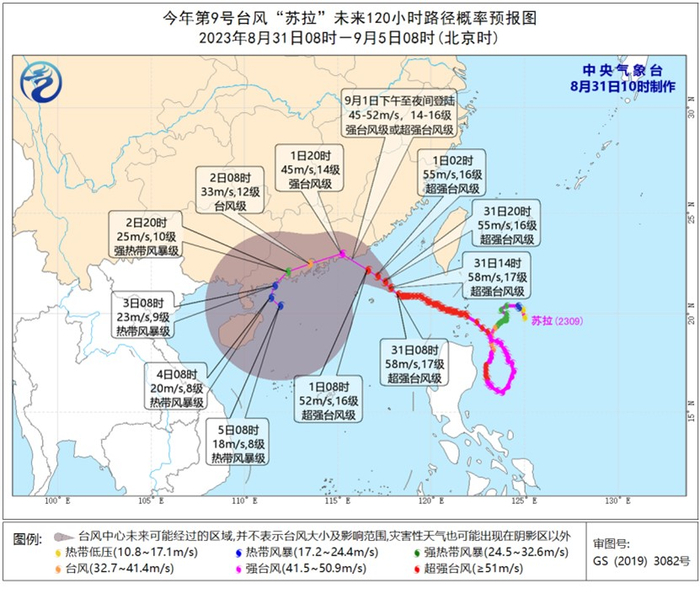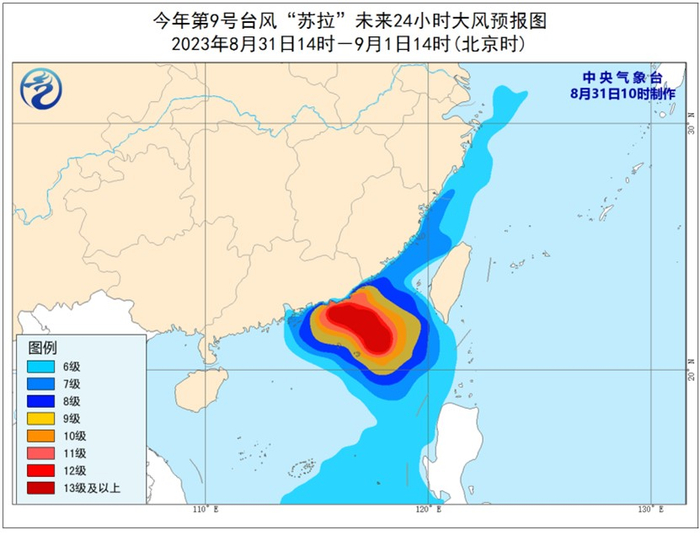 据中央气象台预报,8月31日14时至9月1日14时,巴士海峡、台湾海峡、南海东部和南部、福建沿海、广东中东部沿海、台湾岛南部沿海、东沙群岛将有6—8级、阵风9—10级的大风,其中南海东北部、东沙群岛的风力有9—11级,部分海域风力可达12—13级,“苏拉”中心经过的附近海面风力有14—17级、阵风17级以上。