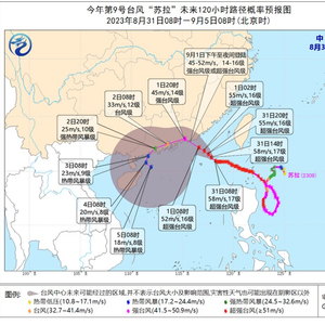 中央气象台8月31日10时发布台风红色预警:今年第9号台风“苏拉”(超强台风级)的中心今天(31日)上午10点钟位于广东汕尾东南方向大约335公里的南海东北部海面,中心附近最大风力有17级(58米/秒)。