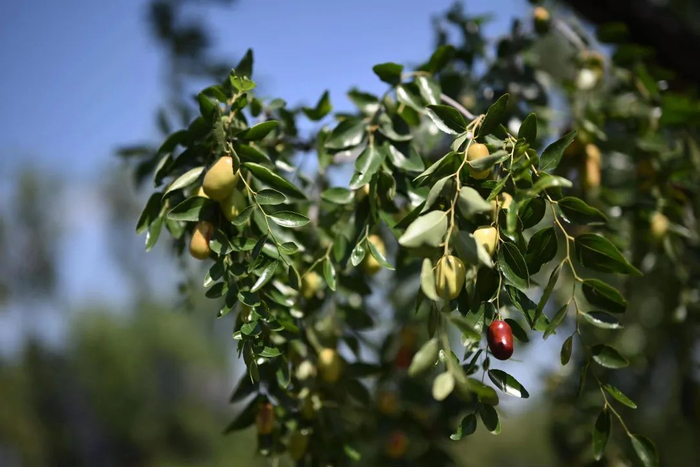 即将开园迎宾的“万棵红枣树”园内,一眼望不到边的古枣林,正在微风中摇曳。遒劲而粗壮的树干,是时光留下的独特印记,有一种古朴的美。顺着树干往上,嫩绿的枝叶抽出无限生机,枣树已挂满了果,随便拉出一枝,就是上百颗果子。部分枣子已被初秋的风染红了脸庞,如玛瑙般点缀在翠绿的叶子间,映衬着碧蓝的天色,显得格外好看;部分枣子尚且翠绿,挺着胖乎乎的身躯继续汲取阳光雨露的滋润,静待以最好的姿态迎接开园后的客人。