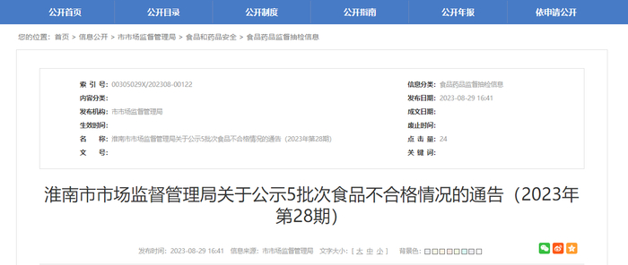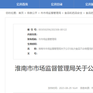 中国质量新闻网讯 近日,安徽省淮南市市场监督管理局发布《淮南市市场监督管理局关于公示5批次食品不合格情况的通告(2023年第28期)》。