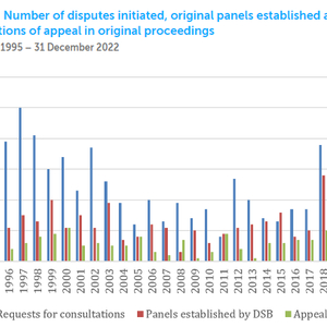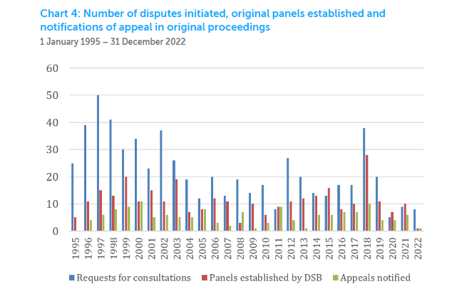 具体而言,1996年至2019年,WTO成员平均每年提出23.7项争端解决程序请求。在过去三年中,新争端申请的平均比率下降到每年7.3起,比上诉机构全面运作期间下降了69%。