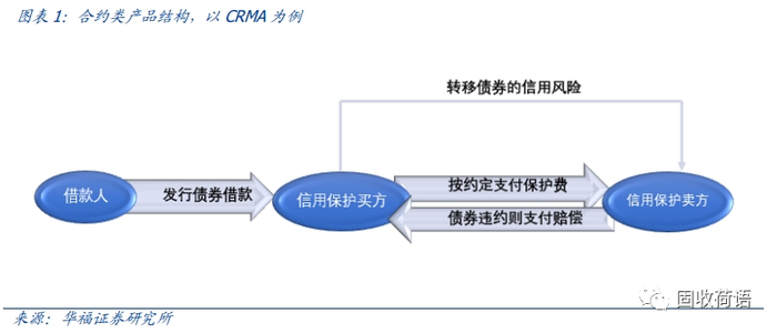信用风险缓释合约(CRMA):是由买方和卖方所签订的一种金融合约,双方在合约中约定,在未来特定期间内,买方依据合约中约定的费用标准及收取情况向卖方支付信用保护费,在合约规定的标的债务存续期间,卖方在收取信用保护费的同时,承担向买方提供信用风险保护的责任,如果未来标的债务发生违约情况,卖方需按照合约约定给予买方相应的赔偿。此外,CRMA是买卖双方私下一对一签署的合同,不可在二级市场流通转让。