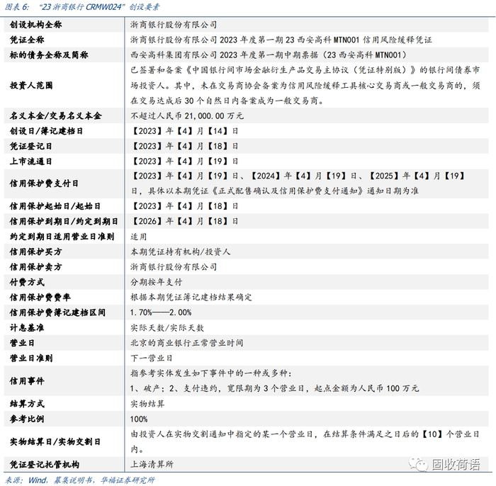 CRMW是标准化的合约,其内部条款具有较强的统一性,我们用2023年新发的“浙商银行股份有限公司2023年度第一期23西安高科MTN001信用风险缓释凭证”(简称“23浙商银行CRMW024”)为例,对CRMW具体条款进行分析解读。