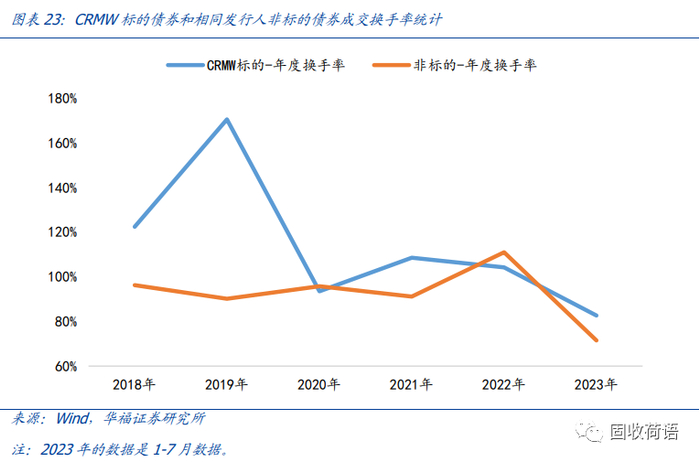 对比相同发行人下的CRMW标的债券和非标的债券的换手率数据,标的债券的换手率是高于非标的债券的,例如2023年1-7月,二者换手率分别为82.64%和71.48%,因此,CRMW产品的创设能有效提高标的债券的流动性。