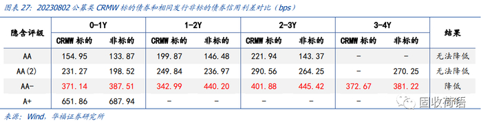 我们计算了目前存续的CRMW产品底层债券的2023年8月2日的信用利差,与相同发行人的非标的债券的信用利差做对比,AA-级标的债券的信用利差明显低于非标的债券10-100bps不等。但是,其他评级下并没有该规律,该规律或不具有普适性。