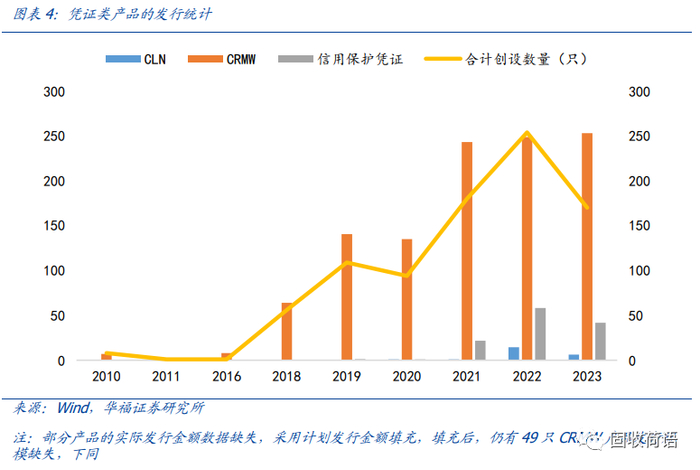 从近年来的凭证类产品的发行规模来看,CRM市场以CRMW产品为主,近三年CRMW产品发行数量平均占据了72%的市场体量;其次为信用保护凭证,2021年、2022年、2023年1-7月分别发行了35只、77只和42只;发行量最少的是CLN品种,整个市场合计只发行了26只产品。