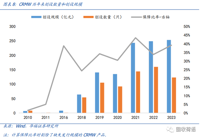 后续,CRMW的创设节奏明显加快,但保障比例整体仍较低。截止2023年7月底,全市场共创设688只产品,创设规模合计1100.13亿元,并且我们预测2023年将是CRMW的发行大年,前7个月的创设规模就已经与去年全年规模持平。