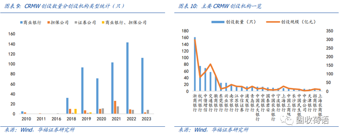 从CRMW历年来的创设数据来看,商业银行创设为市场主流,近年来创设产品占比高达81.25%,其中浙商银行、杭州银行、交通银行、徽商银行、东莞银行和兴业银行创设的CRMW数量较高,分别为161只、75只、57只、45只、25只和25只;另外,担保机构创设的规模也较高,中债增信共创设了69只产品,占比10.03%。