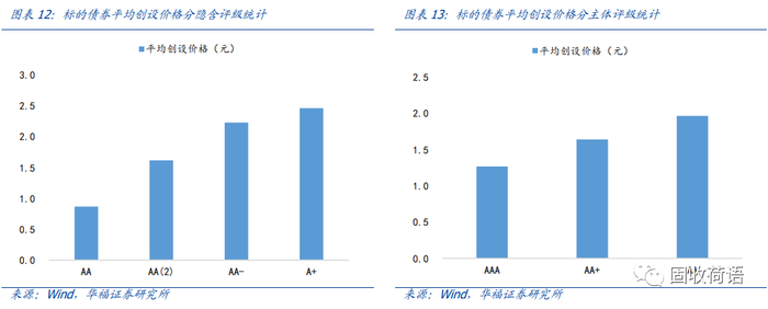 我们认为,由于创设机构需要承担相应的赔付风险,CRMW产品的创设价格的高低能反映出标的主体的信用资质的差异,隐含评级为AA、AA(2)、AA-和A+的标的债券的平均创设价格分别为0.87元、1.62元、2.23元和2.46元,主体评级也有同样的表现。