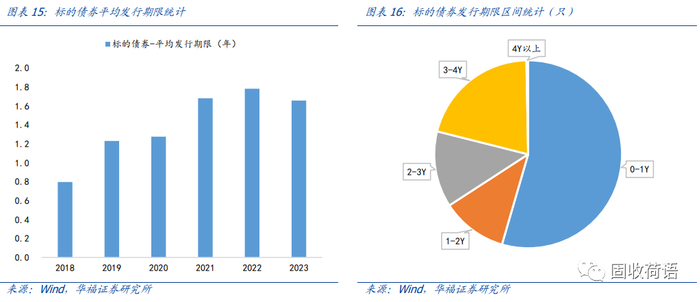 从底层标的债券的行权发行期限来看,有55%的标的债券的期限在1年以内,整体期限偏短,我们认为这反应出市场投资者整体对于此类弱资质信用债和CRMW产品的增信效力整体仍偏谨慎;但近年来标的债券的平均期限已有明显的提升,由2018年的0.80年提升到了2022年的1.78年,反映出随着市场对于CRMW产品的认知加深,对其增信效力的认可度有所提升。