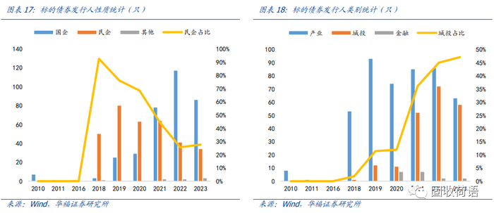 (3)而在2021年供给侧改革和城投端融资明显收紧后,创设机构开始明显转向诸如煤炭、钢铁等周期性产能过剩行业的国企,以及弱资质城投企业,致使当年民企标的占比跌至44.44%,而城投主体的占比攀升至36.11%左右;后一直延续上述态势,2023年1-7月,民企标的占比已跌至27.64%,城投标的占比升至47.15%。