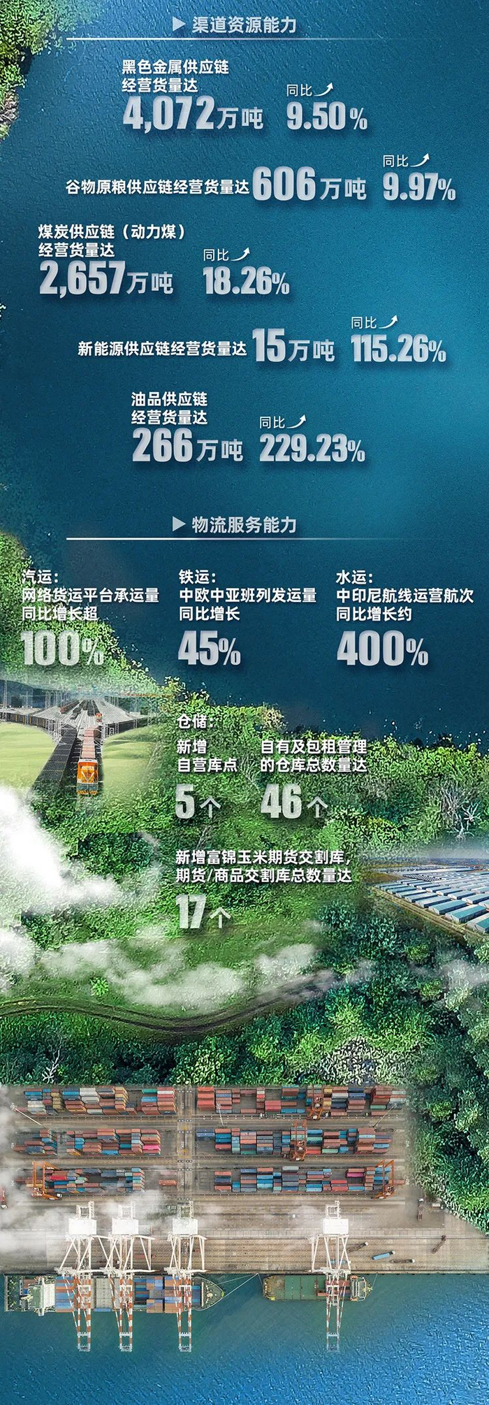 拓展国际业务方面,公司加速构建国际化保障体系,发力国际化业务拓展。一是为契合全球供应链重构趋势,稳步做实属地化平台建设,在越南、印尼、美国等新兴平台区域,逐步落地塑化、铝锭、镍矿、石油焦等多产品属地业务。二是加强国际航线和国际班列运营能力建设,保障海外业务推进;拓展海外仓资源,辐射欧洲、南非、巴西、东南亚等国家和地区,有效提高对产业型客户的综合服务能力。三是大力拓展国际化业务,国际化业务总额约155亿美元,同比增长41%,其中进口总额近100亿美元,同比增长50%。蒙煤通关量同比增加超240%,位居行业前列;铝土矿直采进口量同比增长7倍;原油进口业务进展稳健;光伏产品出口营业收入为去年同期21倍。