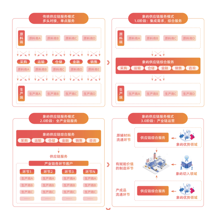 厦门象屿聚焦制造业企业客户核心诉求,持续提供“全方位、多层次、宽领域”的服务,通过优化商品组合、升级业务模式、改善盈利结构,力争在模式引领方面走在行业前列。