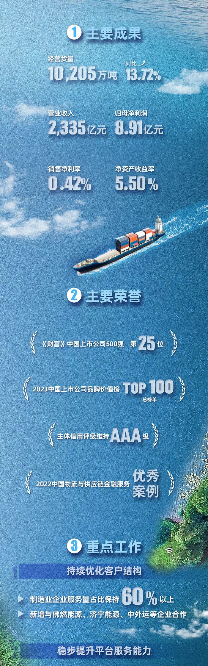 农产品供应链方面,2022-2023 产季秋粮收购总量超 1,100 万吨;新增国家大豆调节储备业务;推进国际化业务布局,在中亚地区成立办事处,并启动首笔大麦采销业务;深化产业链运营模式,持续拓展大豆压榨布局。