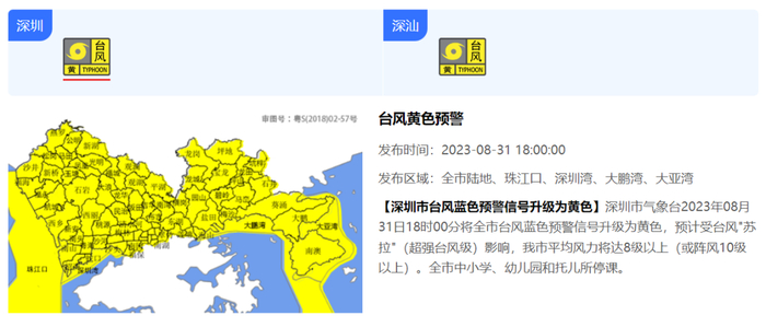 深圳市气象台2023年08月31日18时00分将全市台风蓝色预警信号升级为黄色,预计受台风“苏拉”(超强台风级)影响,我市平均风力将达8级以上(或阵风10级以上)。全市中小学、幼儿园和托儿所停课。