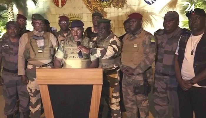 就在选举结果公布后不久,10多名军人以“机构过渡和恢复委员会”的名义在加蓬24电视台发表声明称选举结果无效,同时宣布解散政府、国会、宪法法院等国家机构,关闭国境。“机构过渡和恢复委员会”成员包括“御林军”共和国卫队军官、陆军军官和普通士兵。邦戈则被政变军人软禁。
