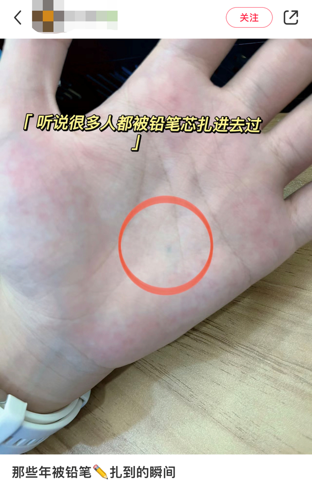 有些朋友被铅笔刺伤后,伤口里残留了少量石墨。愈合后,伤口处会形成一个黑蓝色或青蓝色的“痣”,这在临床上被称为创伤性纹身。